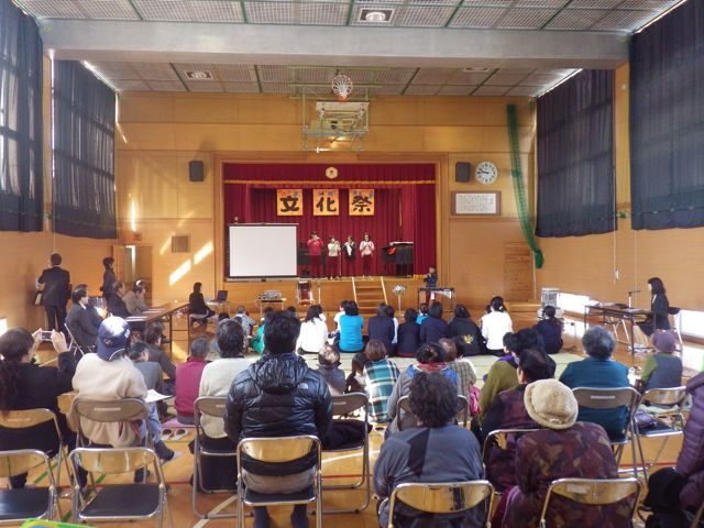 午前中に作っておいた紅白の丸モチを、13時から地域住民7名が背負い、標高差約200mの山の上までカンジキで向かいました。