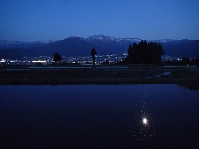 夕方、暮れゆく空に明るい月がかかった。代かきを終えたばかりの田んぼに、まあるい月。濃い青色の世界。この週末に、イロハ田んぼの田植えをする。