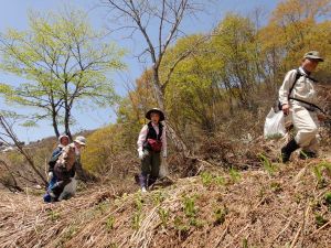 雪が消えたばかり山々は一気に新緑とヤマザクラの花で彩られます。地元の人の案内で、あちらこちらに芽吹く山菜を探しながら散策します。昼食には地元のかあちゃんず特製の「山菜ランチ」が登場します。
